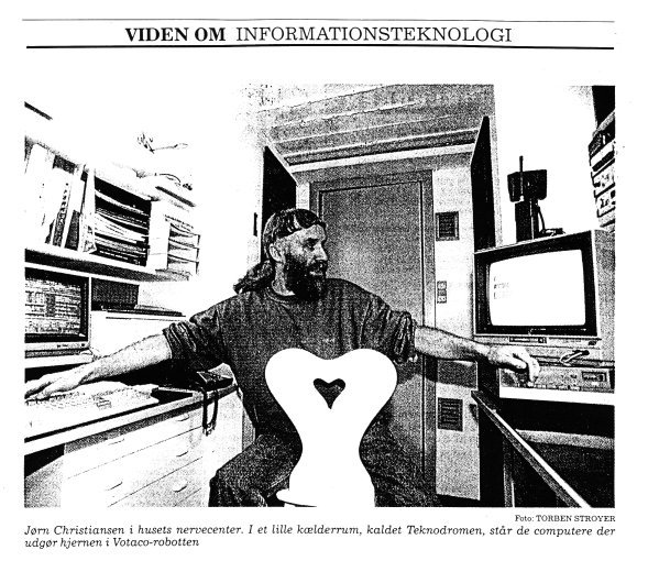 Et hjem med robotHjemme hos Jørn Christiansen er huset en robot, der er bygget til at betjene familien.- En højtalerstemme byder mig velkommen, da døren går op til det gule parcelhus. ”Dette er Votaco. Fordøren er åben,” lyder det fra oven med en naturtro stemme. Det er husets butler, computeren Votaco, der registrerer, at der er kommet gæster. Heldigvis står Jørn Christiansen også i døren til at give mig en mere menneskelig velkomst. Votaco er en usynlig computerbutler, der holder et vågent øje med det 333 m2. store hus i Frederiks, der er en landsby mellem Herning og Viborg. - Den har registreret dig nu. Votaco holder øje med, hvor mange der er i huset, siger Jørn Christiansen, mens et stolt smil lyser op det grå fuldskæg. Fremtidens hus Det er Jørn Christiansen, der har bygget Votaco. Gæster skal se sig godt om for at se spor af den diskrete butler. De små følere på alle døre falder i et med træet. Og de små højtalere i loftet skal peges ud, før man lægger mærke til dem. - Det er fremtidens hus. Om 10 til 20 år har alle familier en husbutler til det kedelige arbejde, mener Jørn Christiansen. ![]() Robotten sladrer Votaco siger venligt godmorgen over højtaleren og giver en kort lokal vejrudsigt, så Niels ved, hvad han skal stå op til. Får det underbevidstheden til at trække dynen godt op over ho-vedet, insisterer Votaco på, at det er på tide at komme op. Og den giver ikke op, hvis det stadig ikke lykkes. Så ringer den til soveværelset over det interne telefonnet for at sladre til farmand. Niels vil ikke stå op. Skulle Jørn Christiansen mod sædvane også være sløv, råber Votaco op over husets højtalere, indtil en får vækket Niels. Vocato læser så nogle tal op, som Niels skal taste ind for at bevise, at han er vågnet. Vejrudsigten er ikke et billigt plagiat fra lokalradioen, men derimod sammenstykket af bl.a. målinger af lufttryk, vindretning, hastighed samt luftfugtighed. Tallene opsamles automatisk af Votaco, der omsætter dem til en vejrudsigt, den kan læse op. Den elektroniske husbutler bruger så den indsamlede viden, når den skal sørge for den rette temperatur i huset. Sparer på energien Pisker der en kold vind mod de store glasfacader, skruer den automatisk ekstra op for varmen, så huset har den helt rigtige temperatur, når Niels, som første mand, sætter fødderne ned på gulvet. Det har givet en energibesparelse på 5.000 kr. om året, fordi Votaco har skruet energiforbruget ned med 25 pct. Før Niels skrider hen ad gangen, skruer Votaco den svage natbelysning op til en mild morgenbelysning. Votaco er jo ikke dum, og ved ligesom Niels, at det er mørkt udenfor. Votaco begynder at vække de andre i huset. Også Ditte, 11 år, Rune, 12 år og Nanna på fire år bliver vækket af Vocato med et venligt godmorgen. Hvis ikke Jørn Christiansen hører andet, kan han roligt gå ud fra, at alle er kommet ud af sengen til rette tid. Vocato siger til Jørn, hvis en af børnene ikke er kommet af sted, eller har glemt at lukke en af yderdørene. Husbutleren tæller ned, til alle er ude. Så slår den tyverialarmen til med infrarød overvågning og sensorer på alle døre. - For 14 dage siden registrerede Vocato, at der var en, der låste sig ind med nøgle på et usædvanligt tidspunkt. Den ved, hvornår vi plejer at komme hjem og ringede mig derfor op på arbejdet for at fortælle, at noget var unormalt. Jeg ringede hjem, og det viste sig at være min datter på 11 år, der var blevet syg og var taget hjem, fortæller Jørn Christiansen. For at kunne tale har Vocato fået indlæst lange talestrømme. Herfra plukker den så brudstykker, når der skal sammensættes sætninger. Derfor er det ikke en digitaliseret computerstemme, der lyder i højtalerne. men derimod et mix af Jørn Christiansens to børn. - Du kan kalde det overvågning, men det er det ikke. Det er en tryghed og en lettelse for os, siger Jørn Christiansen. Hans lange grå hår samlet i en hestehale virker som en kontrast til den enorme EDB-transport, der sker i hjemmets 28 km. ledningsnet. Indretningen har heller ikke spor af hightech, men domineres af rødbrune klinker, krostole i køkkenet og et kæmpe almueskab. Huset afspejler nok meget godt den baggrund, Jørn Christiansen har. Han begyndte oprindeligt med at studere atomfysik, men skiftede til en uddannelse som elektronikmekaniker. Senere tog han en uddannelse som lærer, så der blev tid til hobbyen med elektronik og EDB. I dag er han lærer på Sunds Skole. ![]() Computer i alle rum I hvert sit børneværelse sidder Rune og Ditte på 12 og på 11 år. De spiller computerspil mod hinanden via et netværkskabel. Begge har hovedtelefoner på med en mikrofon foran munden. Derfor kan Rune tale med lillesøster, mens han skyder hende ned i de lange gange i spillet Doom. Jeg spiller nok to til tre timer om dagen, får Rune sagt midt i et skærmskift. Han ligner en jægerpilot i panik, med sine hurtige ryk i joystikket, mens han taler engelsk i mikrofonen. Ikke bare Rune har en computer. Der er en i alle værelser. Men kommandoer til Votaco fra værelserne sker via telefonen. - Den er meget let at styre fra telefonen, når det er mindre kommandoer som en ekstra vækning eller at sætte temperaturen op. Det kan jeg også gøre, når jeg ikke er hjemme, forklarer Jørn Christiansen. Skulle han starte forfra i dag, ville han nok lade alle kommandoer gå til Votaco via computerne. Men hele projektet startede i firserne, hvor computere var væsentlig dyrere end de er i dag. Teknodromen Selve hjertet i styringerne ligger i et lille kælderrum, som Jørn Christiansen kalder Teknodromen. Computeren er selvbygget og ser ikke ud af meget. Den er bygget op om en processor i 68.000 serien. Microcontrollerne har Jørn Christiansen selv bygget. Det var den årlige varmeudgift på 20.000, der fik Jørn Christiansen til at udvikle Votaco. Den er derfor et barn af fattigfirserne. Votaco holder styr på alle vigtige aftaler og fød